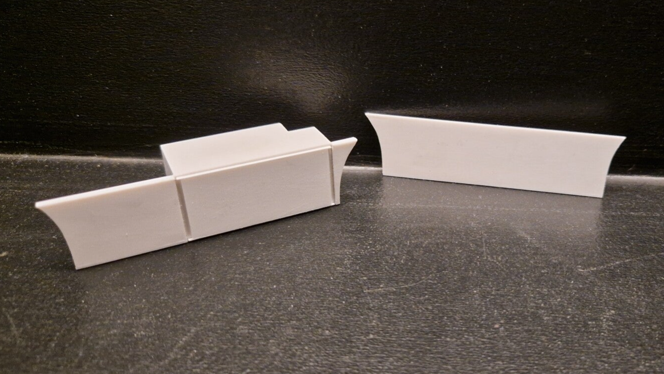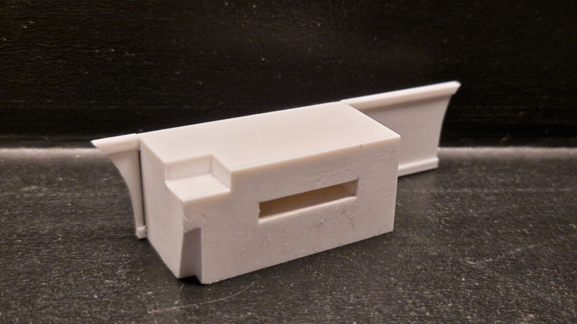 Het eerste wat ik met de bak gedaan heb is het maken van een nieuwe correct duwschot aangezien het origineel niet correct was. Deze heb ik gebouwd door gebruik te maken van Systreenplaat en Evergreen strips. Het schot heb ik verder voorzien van handvaten en haken.