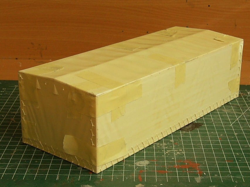 For the trailer, I used two sides because I wanted to extend the box. The tricky thing about extending it is that you have to be careful to get the folds in the hoods right. So you can't just put a piece behind them. I then glued the hoods together and then filled and sanded the seams on the edges and sides for a smooth transition.
