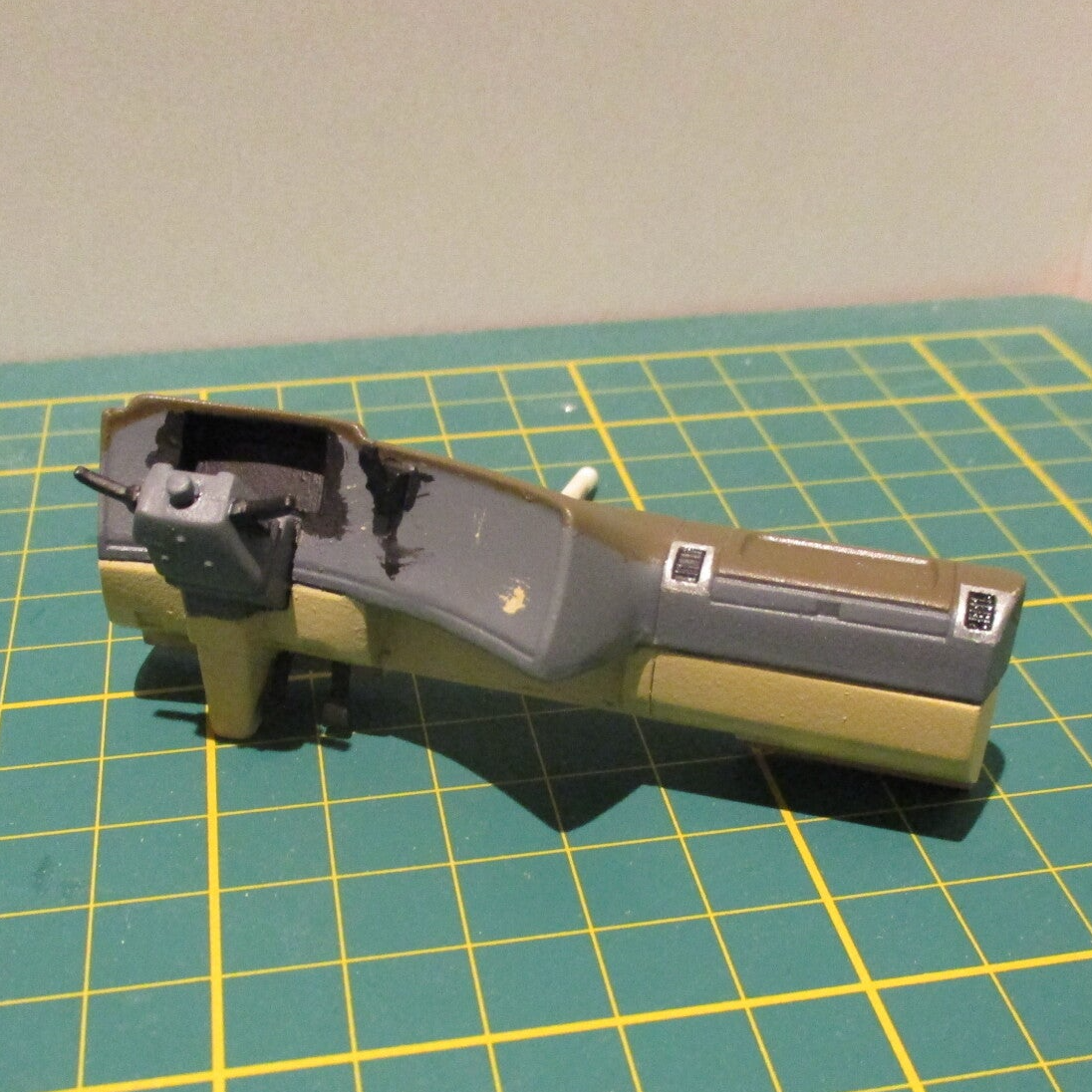 I used the dashboard as a model for modifying the Italeri R1 dashboard. I cast a resin copy of the tunnel storage box under the dashboard in a silicone mold and used it for this model.